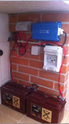Sistema a alimentar 6 lâmpadas de 9W-LED(Equivalente a 60W incandescente), 3 projectores LED 30W mais 1 frigorifico de verão e uma bomba para puxar água de um poço para as torneiras.